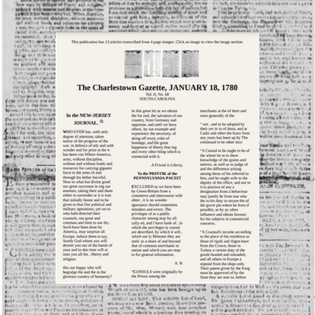 Published contemporaneously with The South-Carolina Gazette, this was the only paper to support the Stamp Act. This publication see-sawed between the Loyalist and Patriot causes throughout its existence.